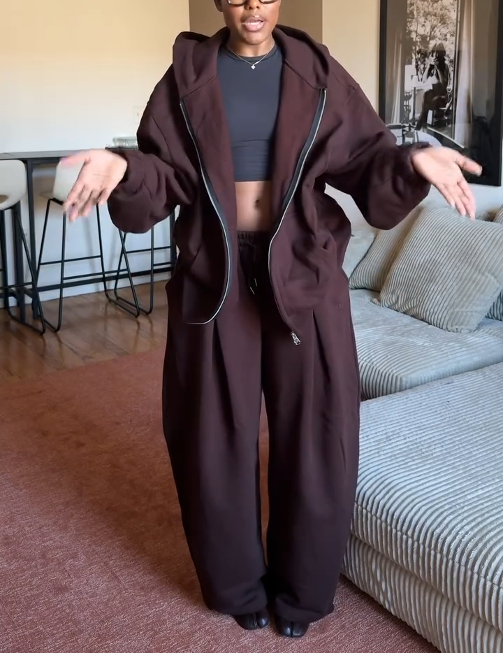 This lightweight and adorable tracksuit is perfect for lounging at home or traveling—definitely more suitable for airport wear than regular workout clothes. The fabric is soft and the workmanship is exquisite. I love the wide sleeves; the whole outfit gives off a relaxed and comfortable feel. The sizing is accurate—I usually wear a small, and even though I bought a small this time, it still has that relaxed fit.
